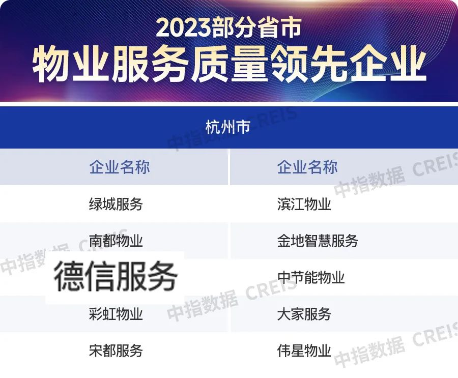 7月6日,中国指数研究院发布2023年上半年主要省市物业服务质量领先企业及标杆项目。德信服务,凭借知己特色的温情服务与高品质的服务质量备受认可,成功获评“2023物业服务质量领先企业(杭州)”。与此同时,德信服务的项目也凭借出色的服务实力在此次发布的研究中获得认可。位于苏州的德信望澜庭,位于杭州的德信钱塘云庄两个项目荣获“2023年上半年五星级物业服务项目”。