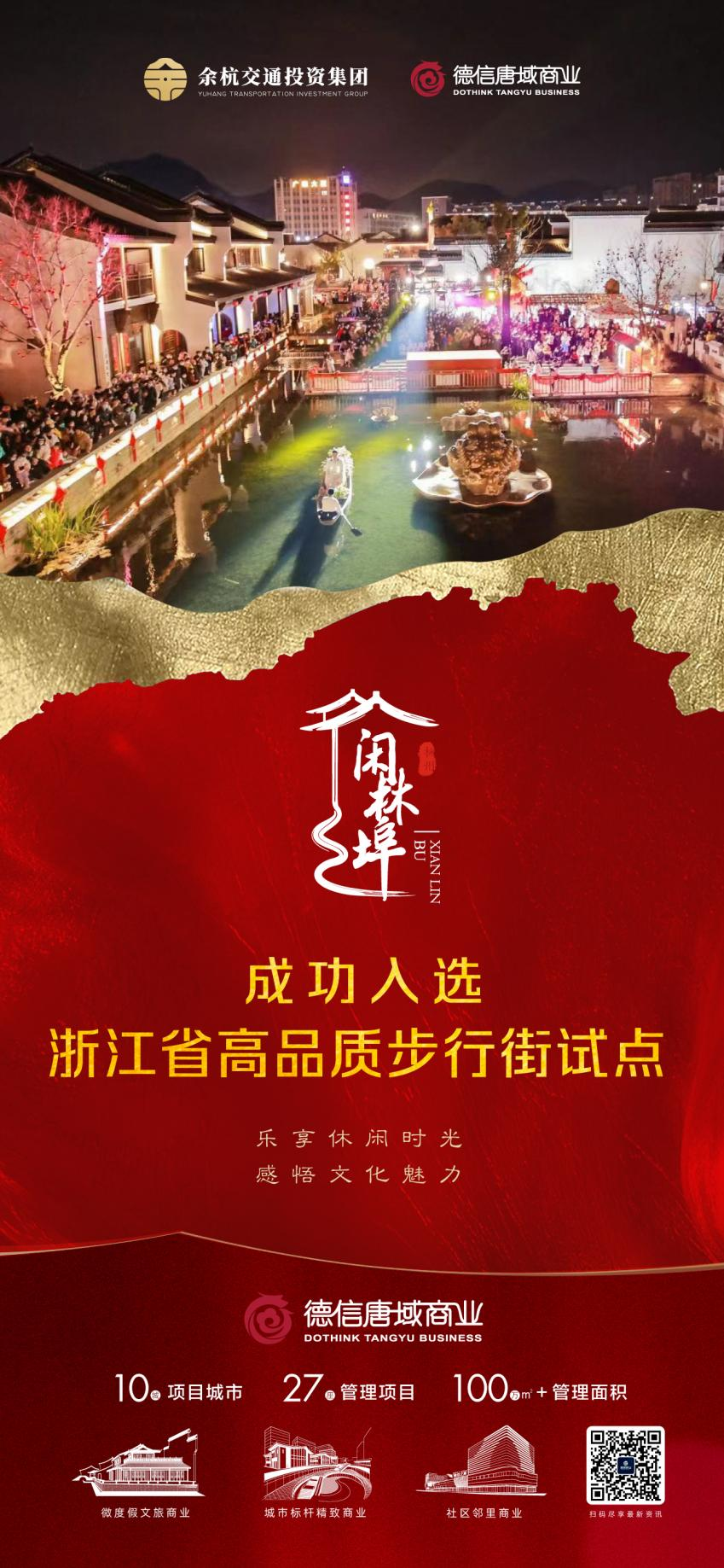 近日,省商务厅公布了2023年度浙江省高品质步行街试点名单,德信唐域商业旗下微度假文旅商业代表项目——闲林埠老街成功上榜。